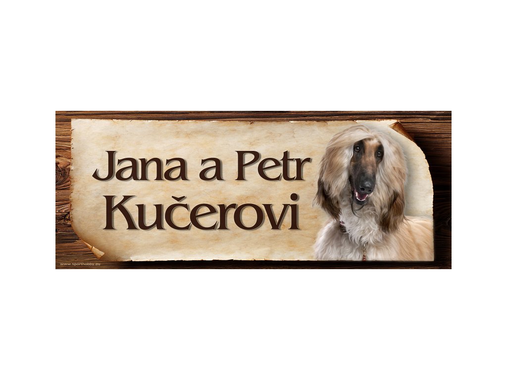 Originální kovová cedulka - Jmenovka na vchodové dveře, schránku, plot, a nebo dokonce se jménem psa na kotec, boudu apod. s vyobrazením psím plemenem. Design a písmo Bangkok vyobrazené na obrázku. Velikosti těchto cedulek jsou 12x5 a 15x6 a 20x8 cm. Cedulky jsou tištěny sublimační technologií Grawerton přímo na hliníkový plech.