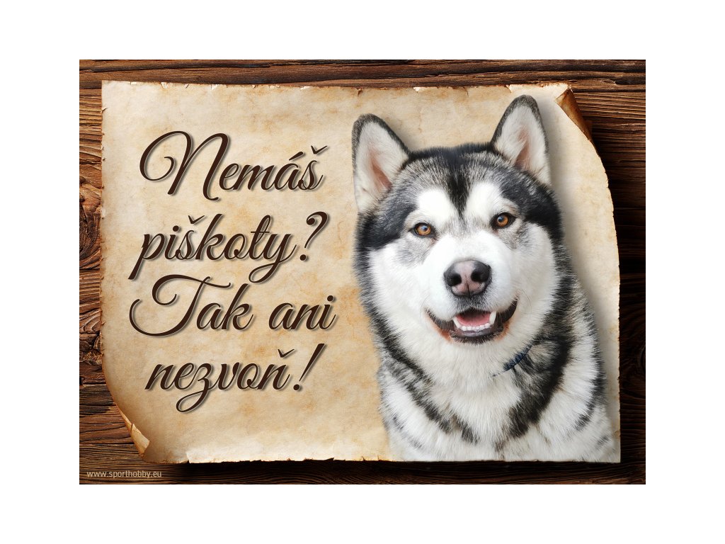 Cedulka s Aljašským malamutem, hliníková s nápisem "Nemáš piškoty? Tak ani nezvoň!" Kovová výstražná venkovní cedulka oznamující to či ono, že se ve vašem obydlí může návštěvník setkat s vašim čtyřnohým miláčkem a jeho teritoriem. Velikosti těchto cedulek jsou 15x11,25 a 20x15 cm. Cedulky jsou tištěny sublimační technologií Grawerton přímo na plech. Cedulky dodáváme běžně se zakulacenými rohy. Pokud budete chtít na cedulku vlastní text, napište nám jej do poznámky.