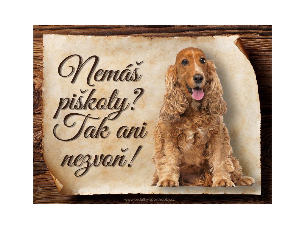 Cedulka s Anglický kokršpaněl VI, hliníková s nápisem "Nemáš piškoty? Tak ani nezvoň!" Kovová výstražná venkovní cedulka oznamující to či ono, že se ve vašem obydlí může návštěvník setkat s vašim čtyřnohým miláčkem a jeho teritoriem. Velikosti těchto cedulek jsou 15x11,25 a 20x15 cm. Cedulky jsou tištěny sublimační technologií Grawerton přímo na plech. Cedulky dodáváme běžně se zakulacenými rohy. Pokud budete chtít na cedulku vlastní text, napište nám jej do poznámky.