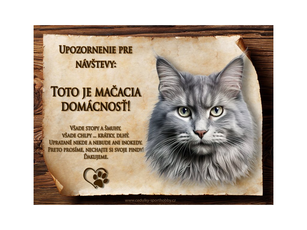Tuto cedulku vyrábíme v češtině i slovenštině. Vtipná kovová cedulka s nápisem "Kočičí domácnost ..." vyobrazení plemene Nebelung. Kovová - hliníková cedulka vhodná pro umístění do domu i na venek. Velikosti této cedulky je 20x15 cm, má zakulacené rohy. Cedulky jsou tištěny sublimační technologií Grawerton přímo na plech.