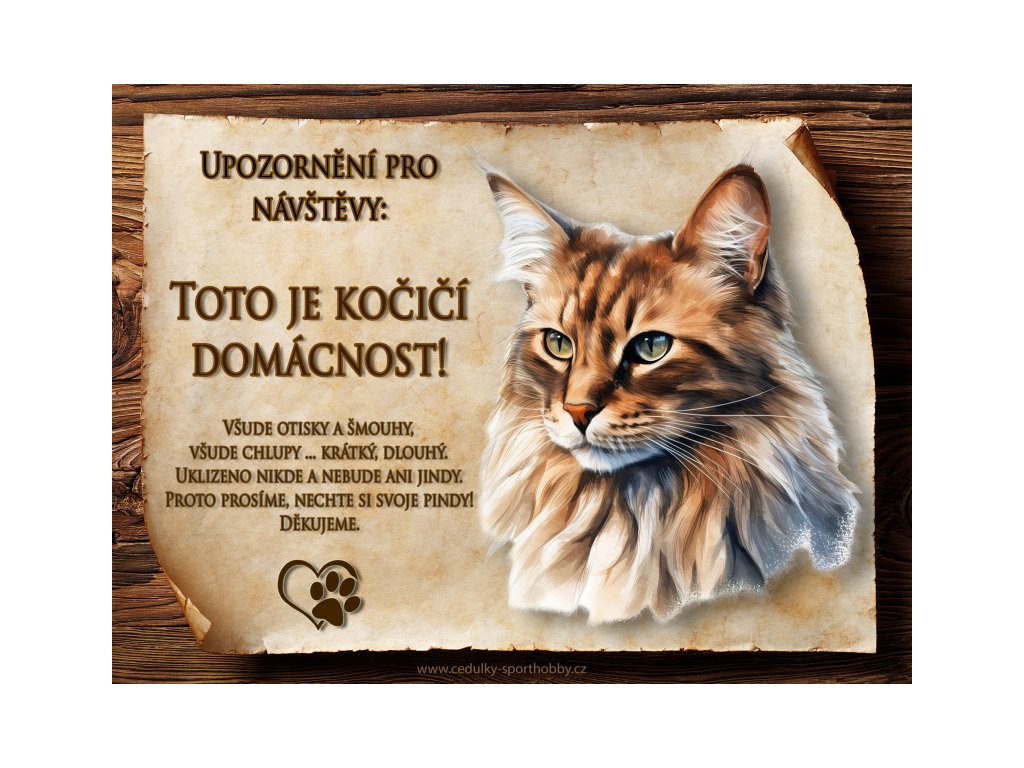 Tuto cedulku vyrábíme v češtině i slovenštině. Vtipná kovová cedulka s nápisem "Kočičí domácnost ..." vyobrazení plemene Somálská 1. Kovová - hliníková cedulka vhodná pro umístění do domu i na venek. Velikosti této cedulky je 20x15 cm, má zakulacené rohy. Cedulky jsou tištěny sublimační technologií Grawerton přímo na plech.