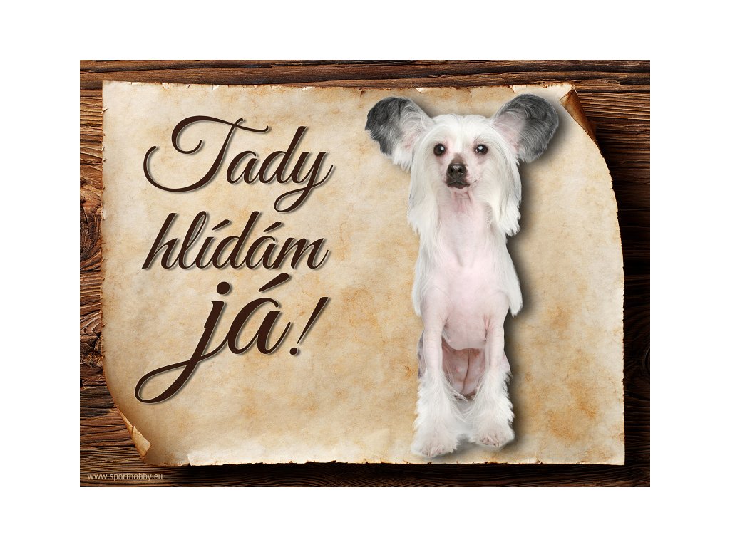 Cedulka Čínský chocholatý pes II, hliníková s nápisem "Tady hlídám já!" Kovová výstražná venkovní cedulka oznamující to či ono, že se ve vašem obydlí může návštěvník setkat s vašim čtyřnohým miláčkem a jeho teritoriem. Velikosti těchto cedulek jsou 15x11,25 a 20x15 cm. Cedulky jsou tištěny sublimační technologií Grawerton přímo na plech. Cedulky dodáváme běžně se zakulacenými rohy. Pokud budete chtít na cedulku vlastní text, napište nám jej do poznámky.