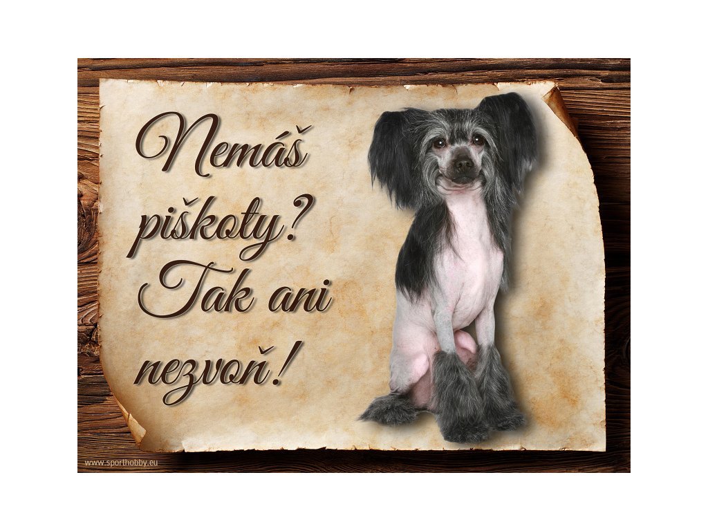 Cedulka Čínský chocholatý pes, hliníková s nápisem "Nemáš piškoty? Tak ani nezvoň!" Kovová výstražná venkovní cedulka oznamující to či ono, že se ve vašem obydlí může návštěvník setkat s vašim čtyřnohým miláčkem a jeho teritoriem. Velikosti těchto cedulek jsou 15x11,25 a 20x15 cm. Cedulky jsou tištěny sublimační technologií Grawerton přímo na plech. Cedulky dodáváme běžně se zakulacenými rohy. Pokud budete chtít na cedulku vlastní text, napište nám jej do poznámky.