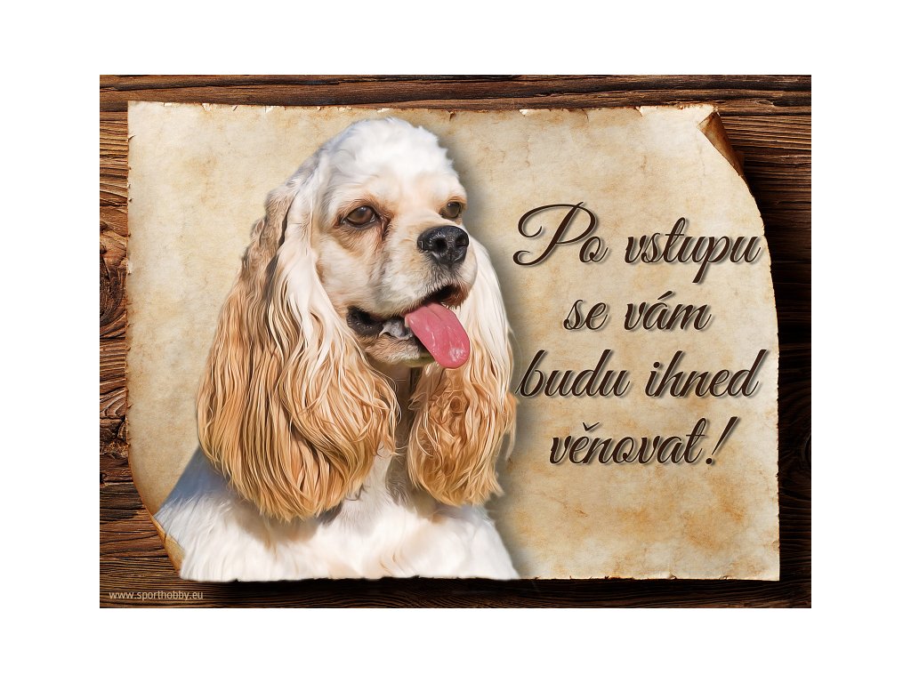 Cedulka s Americký kokršpaněl, hliníková s nápisem "Po vstupu se vám budu hned věnovat!" Kovová výstražná venkovní cedulka oznamující to či ono, že se ve vašem obydlí může návštěvník setkat s vašim čtyřnohým miláčkem a jeho teritoriem. Velikosti těchto cedulek jsou 15x11,25 a 20x15 cm. Cedulky jsou tištěny sublimační technologií Grawerton přímo na plech. Cedulky dodáváme běžně se zakulacenými rohy. Pokud budete chtít na cedulku vlastní text, napište nám jej do poznámky.