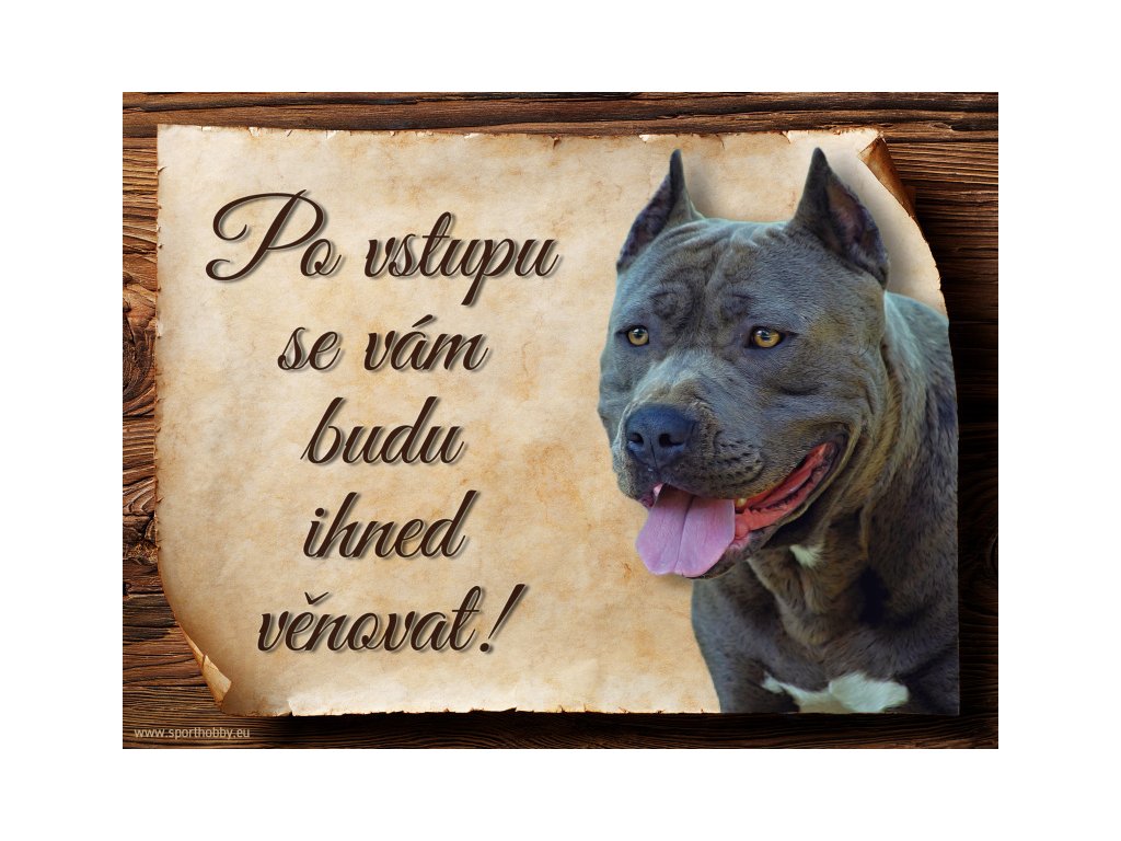 Cedulka Americký stafordširský teriér I, hliníková s nápisem "Po vstupu se vám budu hned věnovat!" Kovová výstražná venkovní cedulka oznamující to či ono, že se ve vašem obydlí může návštěvník setkat s vašim čtyřnohým miláčkem a jeho teritoriem. Velikosti těchto cedulek jsou 15x11,25 a 20x15 cm. Cedulky jsou tištěny sublimační technologií Grawerton přímo na plech. Cedulky dodáváme běžně se zakulacenými rohy. Pokud budete chtít na cedulku vlastní text, napište nám jej do poznámky.