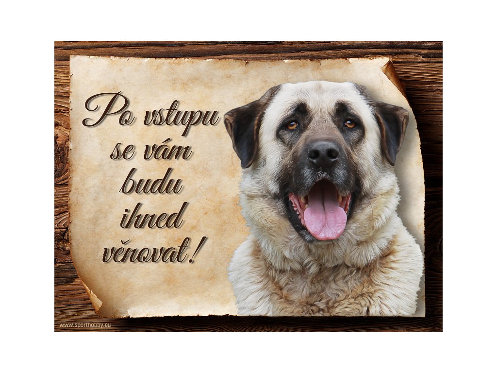Cedulka s Anatolský pastevecký pes, hliníková s nápisem "Po vstupu se vám budu hned věnovat!" Kovová výstražná venkovní cedulka oznamující to či ono, že se ve vašem obydlí může návštěvník setkat s vašim čtyřnohým miláčkem a jeho teritoriem. Velikosti těchto cedulek jsou 15x11,25 a 20x15 cm. Cedulky jsou tištěny sublimační technologií Grawerton přímo na plech. Cedulky dodáváme běžně se zakulacenými rohy. Pokud budete chtít na cedulku vlastní text, napište nám jej do poznámky.