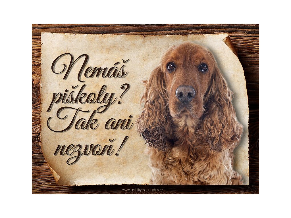 Cedulka Anglický kokršpaněl VIII, hliníková s nápisem "Nemáš piškoty? Tak ani nezvoň!" Kovová výstražná venkovní cedulka oznamující to či ono, že se ve vašem obydlí může návštěvník setkat s vašim čtyřnohým miláčkem a jeho teritoriem. Velikosti těchto cedulek jsou 15x11,25 a 20x15 cm a 27x20 cm. Cedulky jsou tištěny sublimační technologií Grawerton přímo na plech. Cedulky dodáváme běžně se zakulacenými rohy. Pokud budete chtít na cedulku vlastní text, napište nám jej do poznámky.