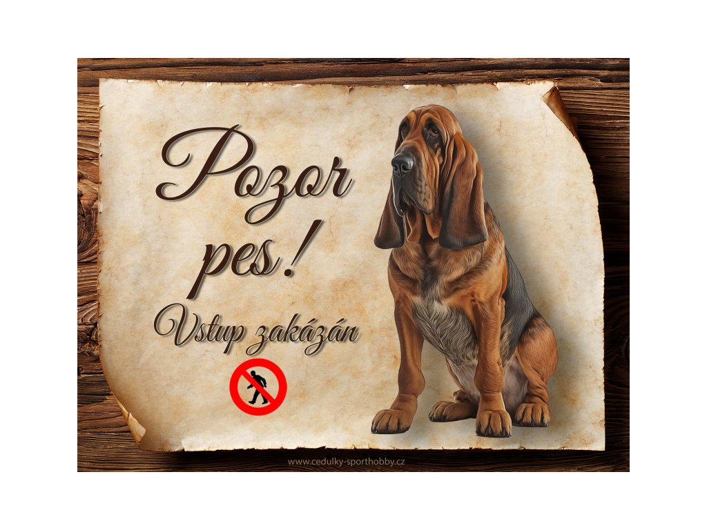 Cedulka s Bloodhound, hliníková s nápisem "Pozor pes! Vstup zakázán!" Kovová výstražná venkovní cedulka oznamující to či ono, že se ve vašem obydlí může návštěvník setkat s vašim čtyřnohým miláčkem a jeho teritoriem. Velikosti těchto cedulek jsou 15x11,25, 20x15 a 27x20 cm. Cedulky jsou tištěny sublimační technologií Grawerton přímo na plech. Cedulky dodáváme běžně se zakulacenými rohy. Pokud budete chtít na cedulku vlastní text, napište nám jej do poznámky.