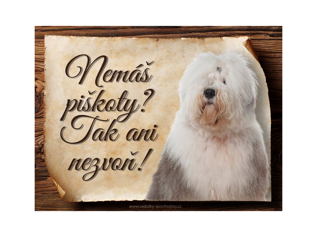 Cedulka s Bobtail, hliníková s nápisem "Nemáš piškoty? Tak ani nezvoň!" Kovová výstražná venkovní cedulka oznamující to či ono, že se ve vašem obydlí může návštěvník setkat s vašim čtyřnohým miláčkem a jeho teritoriem. Velikosti těchto cedulek jsou 15x11,25 a 20x15 a 27x20 cm. Cedulky jsou tištěny sublimační technologií Grawerton přímo na plech. Cedulky dodáváme běžně se zakulacenými rohy. Pokud budete chtít na cedulku vlastní text, napište nám jej do poznámky.