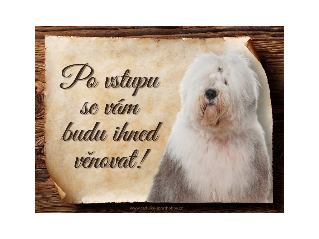Cedulka s Bobtail, hliníková s nápisem "Po vstupu ...!" Kovová výstražná venkovní cedulka oznamující to či ono, že se ve vašem obydlí může návštěvník setkat s vašim čtyřnohým miláčkem a jeho teritoriem. Velikosti těchto cedulek jsou 15x11,25 a 20x15 a 27x20 cm. Cedulky jsou tištěny sublimační technologií Grawerton přímo na plech. Cedulky dodáváme běžně se zakulacenými rohy. Pokud budete chtít na cedulku vlastní text, napište nám jej do poznámky.