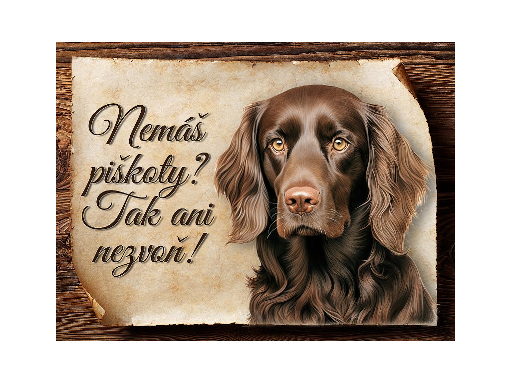 Cedulka s Boykin španělI, hliníková s nápisem "Nemáš piškoty? Tak ani nezvoň!" Kovová výstražná venkovní cedulka oznamující to či ono, že se ve vašem obydlí může návštěvník setkat s vašim čtyřnohým miláčkem a jeho teritoriem. Velikosti těchto cedulek jsou 15x11,25 a 20x15 a 27x20 cm. Cedulky jsou tištěny sublimační technologií Grawerton přímo na plech. Cedulky dodáváme běžně se zakulacenými rohy. Pokud budete chtít na cedulku vlastní text, napište nám jej do poznámky.