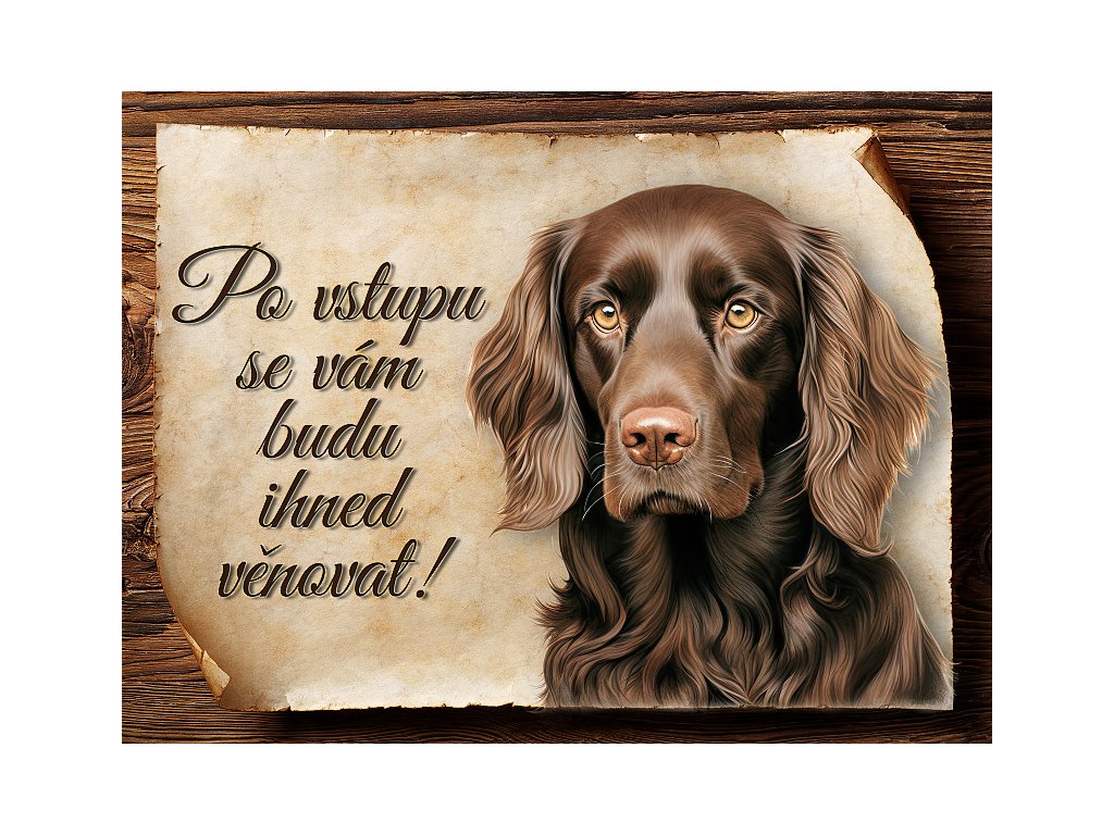 Cedulka s Boykin španěl, hliníková s nápisem "Po vstupu ...!" Kovová výstražná venkovní cedulka oznamující to či ono, že se ve vašem obydlí může návštěvník setkat s vašim čtyřnohým miláčkem a jeho teritoriem. Velikosti těchto cedulek jsou 15x11,25 a 20x15 a 27x20 cm. Cedulky jsou tištěny sublimační technologií Grawerton přímo na plech. Cedulky dodáváme běžně se zakulacenými rohy. Pokud budete chtít na cedulku vlastní text, napište nám jej do poznámky.