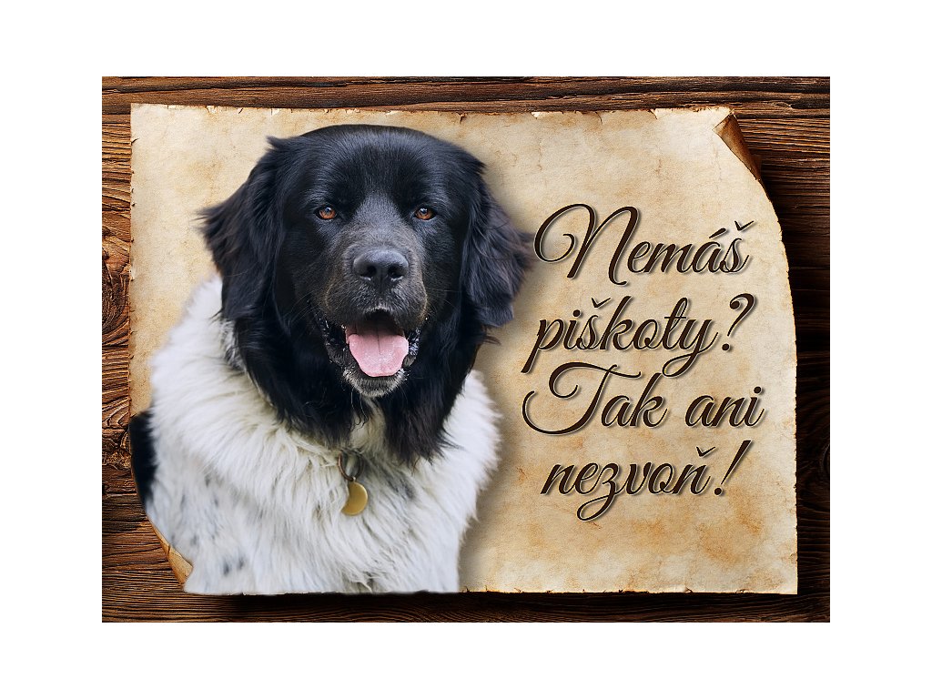 Cedulka s Český horský pes, hliníková s nápisem "Nemáš piškoty? Tak ani nezvoň!" Kovová výstražná venkovní cedulka oznamující to či ono, že se ve vašem obydlí může návštěvník setkat s vašim čtyřnohým miláčkem a jeho teritoriem. Velikosti těchto cedulek jsou 15x11,25 a 20x15 a 27x20 cm. Cedulky jsou tištěny sublimační technologií Grawerton přímo na plech. Cedulky dodáváme běžně se zakulacenými rohy. Pokud budete chtít na cedulku vlastní text, napište nám jej do poznámky.