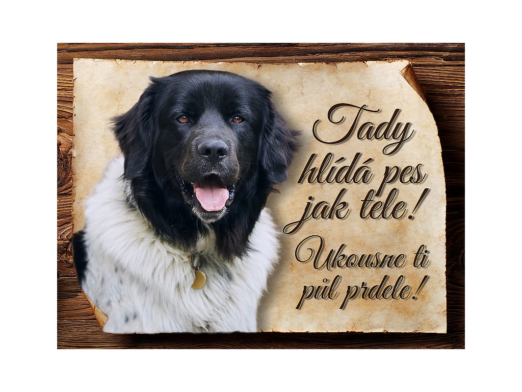 Cedulka s Český horský pes, hliníková s nápisem "Tady hlídá pes jak tele...!" Kovová výstražná venkovní cedulka oznamující to či ono, že se ve vašem obydlí může návštěvník setkat s vašim čtyřnohým miláčkem a jeho teritoriem. Velikosti těchto cedulek jsou 15x11,25, 20x15 a 27x20 cm. Cedulky jsou tištěny sublimační technologií Grawerton přímo na plech. Cedulky dodáváme běžně se zakulacenými rohy. Pokud budete chtít na cedulku vlastní text, napište nám jej do poznámky.