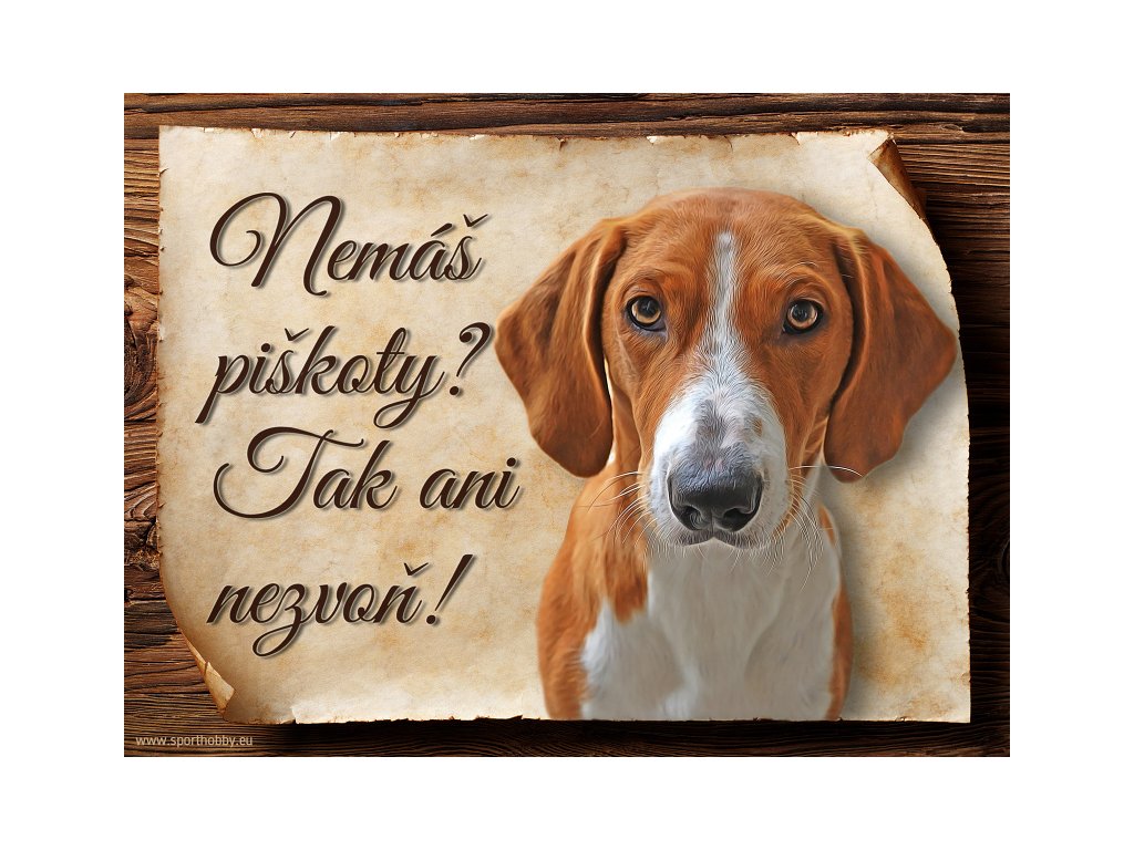 Cedulka Drever, hliníková s nápisem "Nemáš piškoty? Tak ani nezvoň!" Kovová výstražná venkovní cedulka oznamující to či ono, že se ve vašem obydlí může návštěvník setkat s vašim čtyřnohým miláčkem a jeho teritoriem. Velikosti těchto cedulek jsou 15x11,25 a 20x15 cm a 27x20 cm. Cedulky jsou tištěny sublimační technologií Grawerton přímo na plech. Cedulky dodáváme běžně se zakulacenými rohy. Pokud budete chtít na cedulku vlastní text, napište nám jej do poznámky.