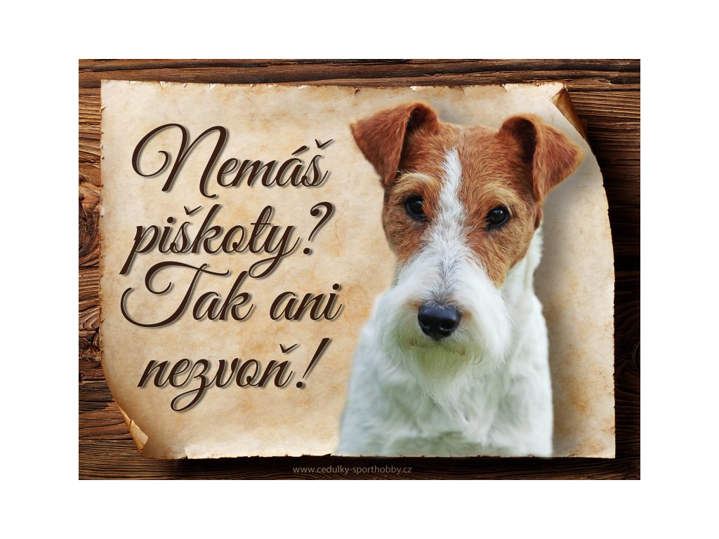 Cedulka s Foxterier, hliníková s nápisem "Nemáš piškoty? Tak ani nezvoň!" Kovová výstražná venkovní cedulka oznamující to či ono, že se ve vašem obydlí může návštěvník setkat s vašim čtyřnohým miláčkem a jeho teritoriem. Velikosti těchto cedulek jsou 15x11,25 a 20x15 a 27x20 cm. Cedulky jsou tištěny sublimační technologií Grawerton přímo na plech. Cedulky dodáváme běžně se zakulacenými rohy. Pokud budete chtít na cedulku vlastní text, napište nám jej do poznámky.
