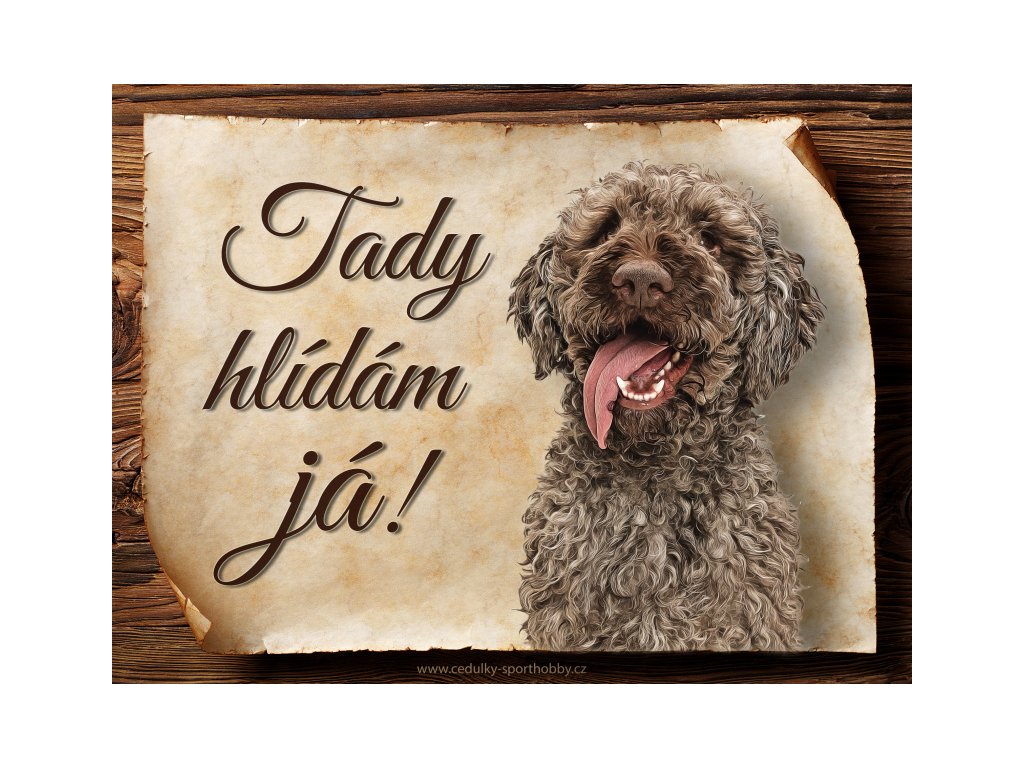 Cedulka s Italský vodní pes I, hliníková s nápisem "Tady hlídám já!" Kovová výstražná venkovní cedulka oznamující to či ono, že se ve vašem obydlí může návštěvník setkat s vašim čtyřnohým miláčkem a jeho teritoriem. Velikosti těchto cedulek jsou 15x11,25 a 20x15 a 27x20 cm. Cedulky jsou tištěny sublimační technologií Grawerton přímo na plech. Cedulky dodáváme běžně se zakulacenými rohy. Pokud budete chtít na cedulku vlastní text, napište nám jej do poznámky.