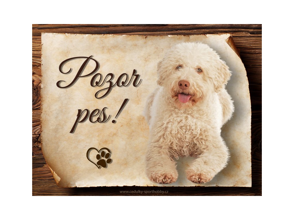 Cedulka s Italský vodní pes II, hliníková s nápisem "Pozor pes!" Kovová výstražná venkovní cedulka oznamující to či ono, že se ve vašem obydlí může návštěvník setkat s vašim čtyřnohým miláčkem a jeho teritoriem. Velikosti těchto cedulek jsou 15x11,25 a 20x15 a 27x20 cm. Cedulky jsou tištěny sublimační technologií Grawerton přímo na plech. Cedulky dodáváme běžně se zakulacenými rohy. Pokud budete chtít na cedulku vlastní text, napište nám jej do poznámky.