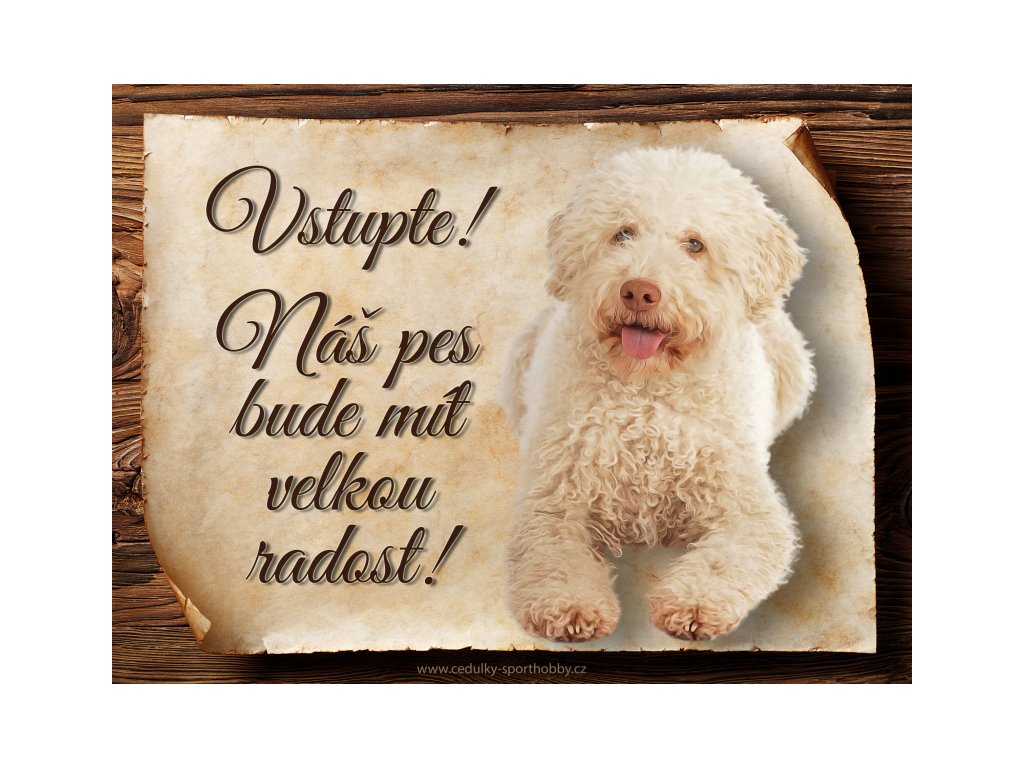 Cedulka s Italský vodní pes II, hliníková s nápisem "Vstupte! Náš pes bude mít velkou radost!" Kovová výstražná venkovní cedulka oznamující to či ono, že se ve vašem obydlí může návštěvník setkat s vašim čtyřnohým miláčkem a jeho teritoriem. Velikosti těchto cedulek jsou 15x11,25, 20x15 a 27x20 cm. Cedulky jsou tištěny sublimační technologií Grawerton přímo na plech. Cedulky dodáváme běžně se zakulacenými rohy. Pokud budete chtít na cedulku vlastní text, napište nám jej do poznámky.
