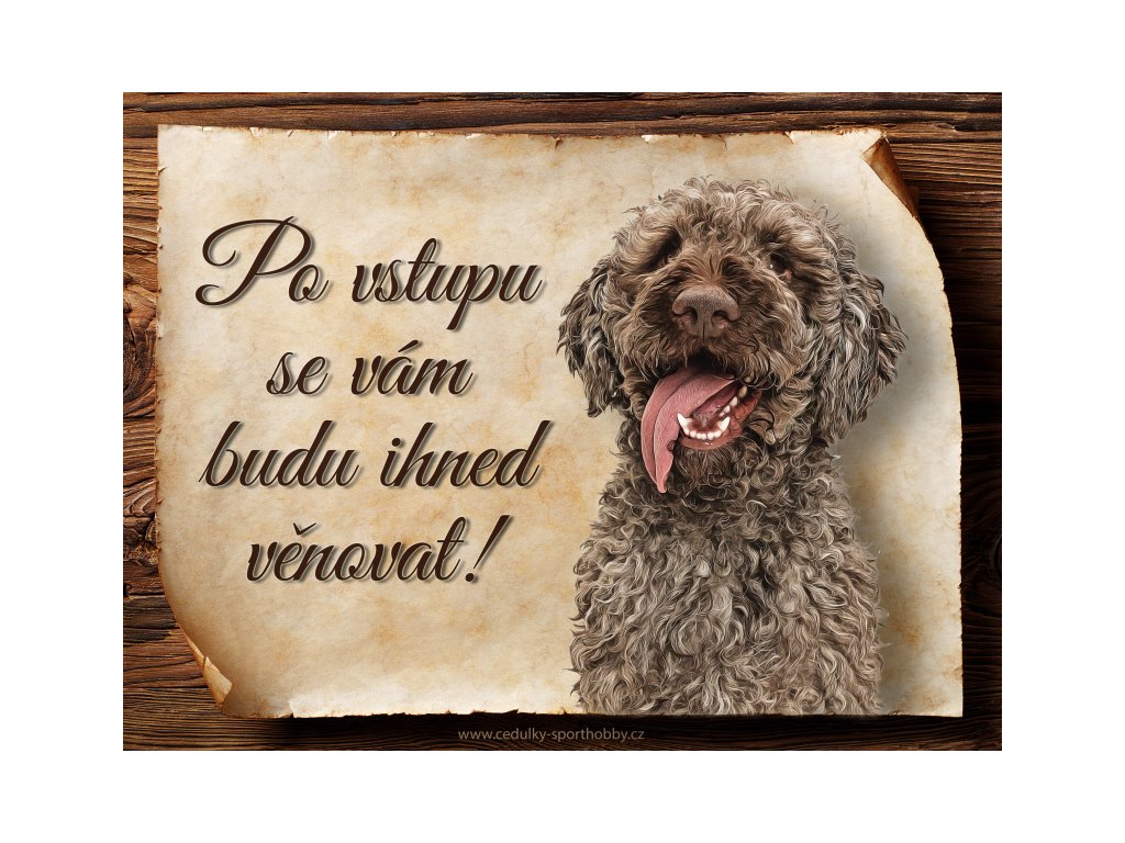 Cedulka s Italský vodní pes, hliníková s nápisem "Po vstupu ...!" Kovová výstražná venkovní cedulka oznamující to či ono, že se ve vašem obydlí může návštěvník setkat s vašim čtyřnohým miláčkem a jeho teritoriem. Velikosti těchto cedulek jsou 15x11,25 a 20x15 a 27x20 cm. Cedulky jsou tištěny sublimační technologií Grawerton přímo na plech. Cedulky dodáváme běžně se zakulacenými rohy. Pokud budete chtít na cedulku vlastní text, napište nám jej do poznámky.