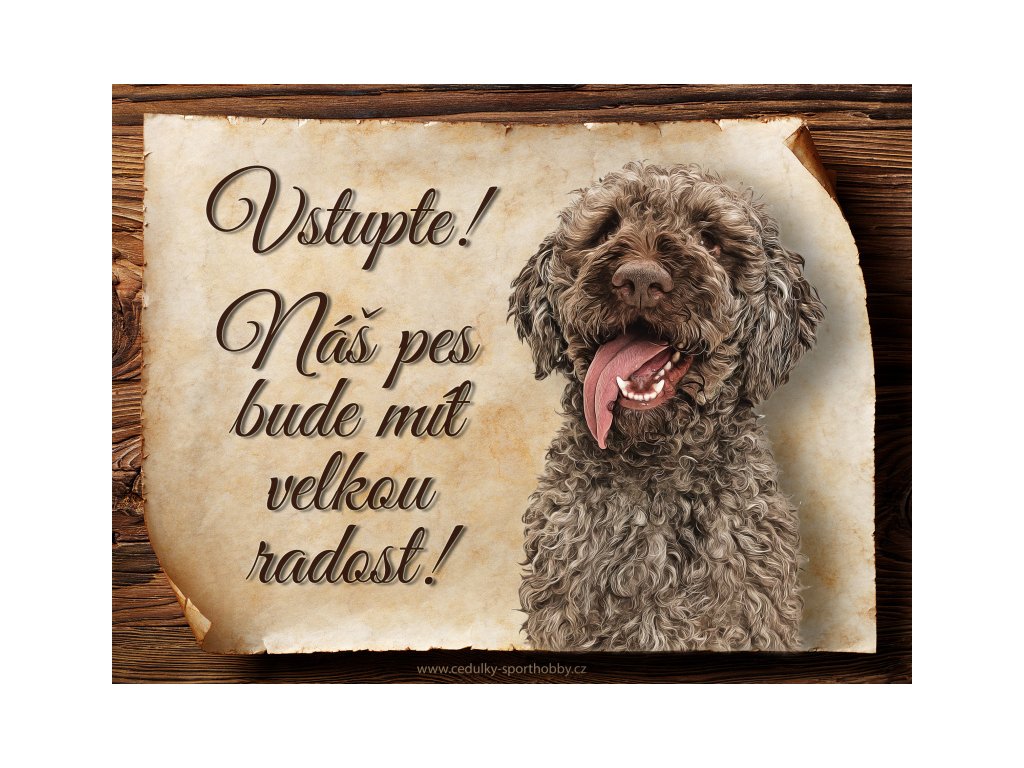 Cedulka s Italský vodní pes, hliníková s nápisem "Vstupte! Náš pes bude mít velkou radost!" Kovová výstražná venkovní cedulka oznamující to či ono, že se ve vašem obydlí může návštěvník setkat s vašim čtyřnohým miláčkem a jeho teritoriem. Velikosti těchto cedulek jsou 15x11,25, 20x15 a 27x20 cm. Cedulky jsou tištěny sublimační technologií Grawerton přímo na plech. Cedulky dodáváme běžně se zakulacenými rohy. Pokud budete chtít na cedulku vlastní text, napište nám jej do poznámky.