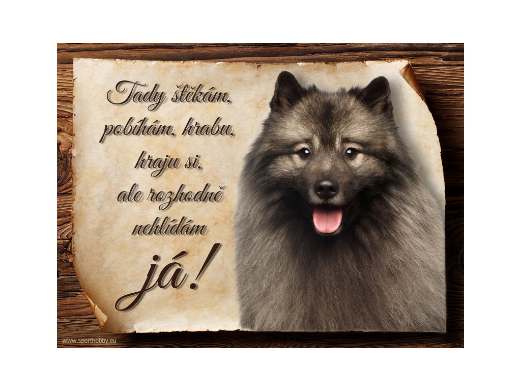 Cedulka Německý špic vlčí, hliníková s nápisem "Tady štěkám, pobíhám, hrabu, hraju si, ale rozhodně nehlídám já!!" Kovová výstražná venkovní cedulka oznamující to či ono, že se ve vašem obydlí může návštěvník setkat s vašim čtyřnohým miláčkem a jeho teritoriem. Velikosti těchto cedulek jsou 15x11,25 a 20x15 a 27x20 cm. Cedulky jsou tištěny sublimační technologií Grawerton přímo na plech. Cedulky dodáváme běžně se zakulacenými rohy. Pokud budete chtít na cedulku vlastní text, napište nám jej do poznámky.