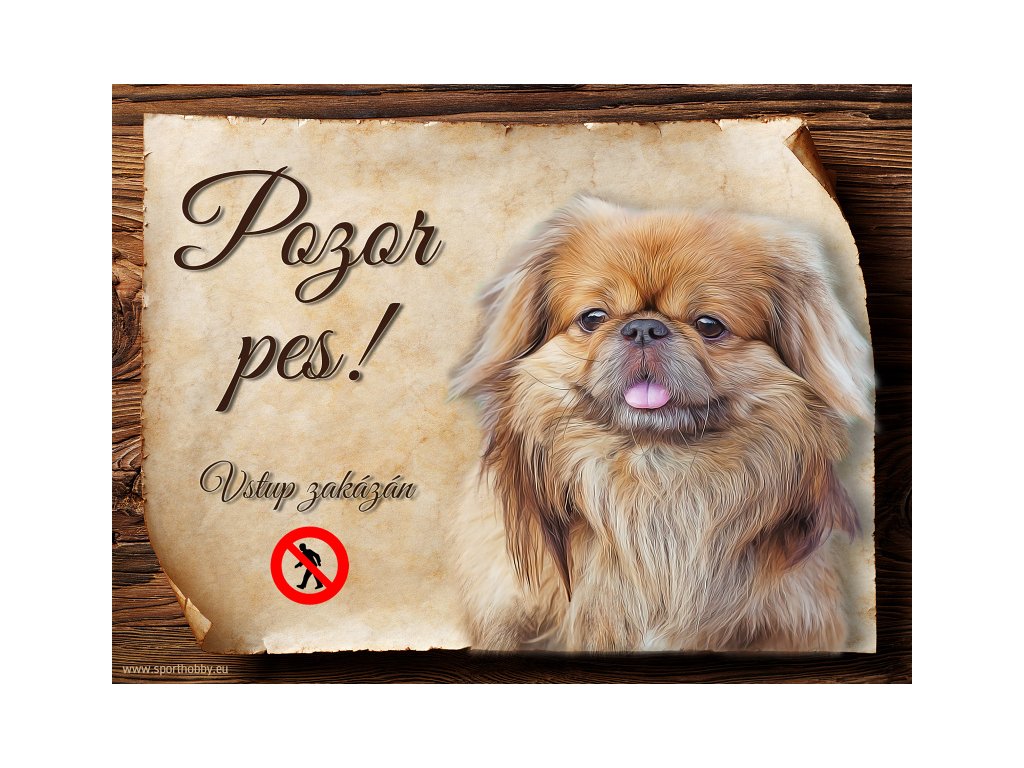 Cedulka Pekingský palácový psík hliníková s nápisem "Pozor pes! Vstup zakázán." Kovová výstražná venkovní cedulka oznamující to či ono, že se ve vašem obydlí může návštěvník setkat s vašim čtyřnohým miláčkem a jeho teritoriem. Velikosti těchto cedulek jsou 15x11,25 a 20x15 cm. Cedulky jsou tištěny sublimační technologií Grawerton přímo na plech. Cedulky dodáváme běžně se zakulacenými rohy. Pokud budete chtít na cedulku vlastní text, napište nám jej do poznámky.