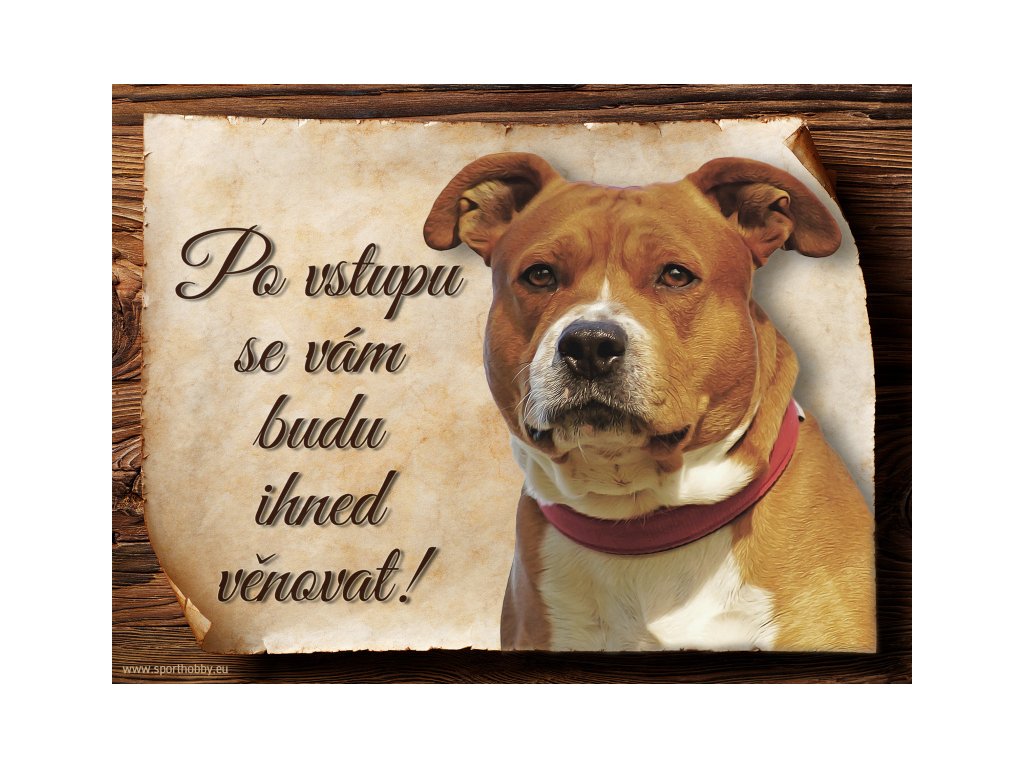Cedulka Stafordširský bulteriér IV, hliníková s nápisem "Po vstupu se vám budu hned věnovat!" Kovová výstražná venkovní cedulka oznamující to či ono, že se ve vašem obydlí může návštěvník setkat s vašim čtyřnohým miláčkem a jeho teritoriem. Velikosti těchto cedulek jsou 15x11,25 a 20x15 cm. Cedulky jsou tištěny sublimační technologií Grawerton přímo na plech. Cedulky dodáváme běžně se zakulacenými rohy. Pokud budete chtít na cedulku vlastní text, napište nám jej do poznámky.