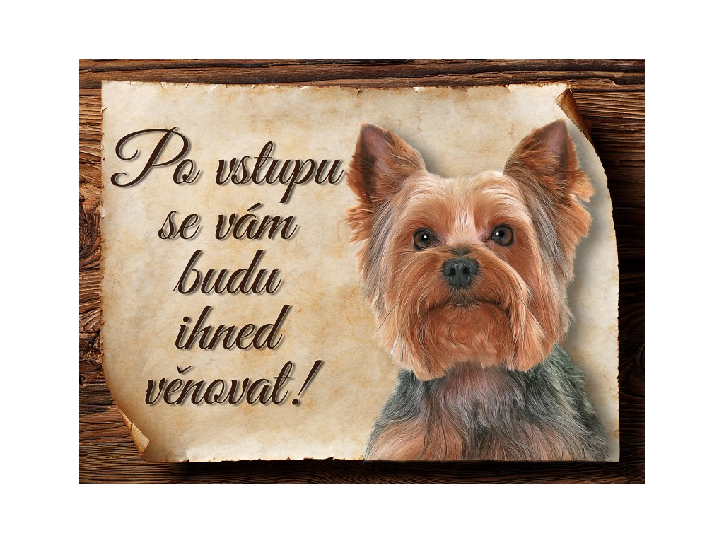 Cedulka Yorkšírský terier II hliníková s nápisem "Po vstupu se vám budu hned věnovat!" Kovová výstražná venkovní cedulka oznamující to či ono, že se ve vašem obydlí může návštěvník setkat s vašim čtyřnohým miláčkem a jeho teritoriem. Velikosti těchto cedulek jsou 15x11,25 a 20x15 cm. Cedulky jsou tištěny sublimační technologií Grawerton přímo na plech. Cedulky dodáváme běžně se zakulacenými rohy. Pokud budete chtít na cedulku vlastní text, napište nám jej do poznámky.