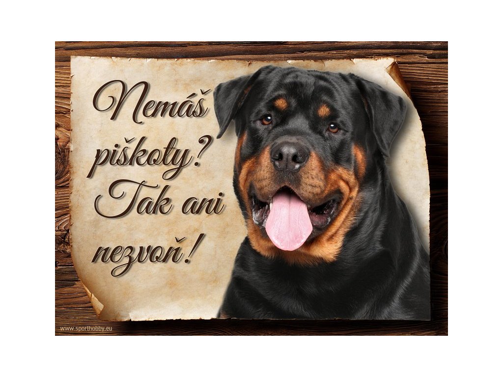 Cedulka Rotvajler II, hliníková s nápisem "Nemáš piškoty? Tak ani nezvoň!" Kovová výstražná venkovní cedulka oznamující to či ono, že se ve vašem obydlí může návštěvník setkat s vašim čtyřnohým miláčkem a jeho teritoriem. Velikosti těchto cedulek jsou 15x11,25 a 20x15 cm. Cedulky jsou tištěny sublimační technologií Grawerton přímo na plech. Cedulky dodáváme běžně se zakulacenými rohy. Pokud budete chtít na cedulku vlastní text, napište nám jej do poznámky.