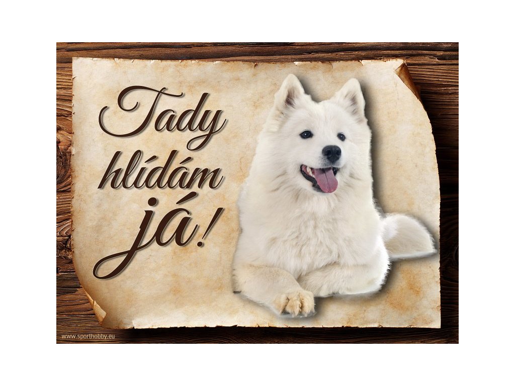 Cedulka Samojed, hliníková s nápisem "Vstupte! Náš pes bude mít velkou radost!" Kovová výstražná venkovní cedulka oznamující to či ono, že se ve vašem obydlí může návštěvník setkat s vašim čtyřnohým miláčkem a jeho teritoriem. Velikosti těchto cedulek jsou 15x11,25 a 20x15 cm. Cedulky jsou tištěny sublimační technologií Grawerton přímo na plech. Cedulky dodáváme běžně se zakulacenými rohy. Pokud budete chtít na cedulku vlastní text, napište nám jej do poznámky.