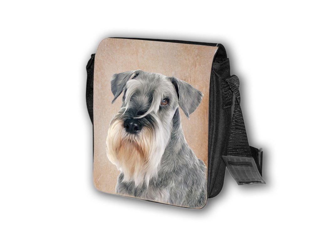 Nylonová vycházková taška s popruhem přes rameno, černé barvy. Velikost tašky je 21x20 cm. Na omyvatelné, odnímatelné ploše velikosti 17x20 cm je krásný paint potisk Knírač.